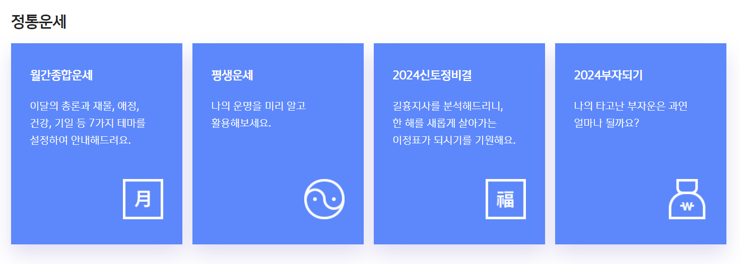 - 다양한 운세 정보 제공: 하루의 운세부터 월간, 연간 운세까지 다양하게 확인할 수 있어 여러 상황에 맞는 운세를 참고할 수 있습니다.